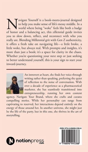 Navigate Yourself is a book-meets-journal designed to help you make sense of life's messy middle. In a world where being "woke" feels like both a badge of honor and a balancing act, this zillennial guide invites you to slow down, reflect, and reconnect with who you really are. Blending Millennial grit with Gen Z authenticity, it offers a fresh take on navigating life-a little broke, a little woke, but always real. With prompts and insights, it's more than just a book; it's a space for clarity in the chaos. Whether you're questioning your next step or just seeking to better understand yourself, this is your sign to start your inward-journey.