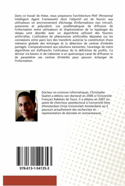 Dans ce travail de thèse, nous proposons l'architecture PIAF (Personnal Intelligent Agent Framework) dont l'objectif est de fournir aux utilisateurs un environnement d'échange d'informations non intrusif, autonome et polyvalent. Les problématiques de diffusion de l'information entre utilisateurs et d'optimisation de la topologie du réseau sont abordés avec un algorithme utilisant des fourmis artificielles. L'utilisation de phéromones artificielles déposées sur les connexions entre pairs lors des transferts autorise la constitution d'une mémoire globale des échanges et la détection de centres d'intérêts partagés. Comparativement aux solutions existantes, l'avantage de notre algorithme est d'affranchir l'utilisateur de la définition de profils. Ce dernier n'a besoin ni de s'abonner à un quelconque canal de diffusion ni de paramétrer ses centres d'intérêts pour pouvoir échanger de l'information.