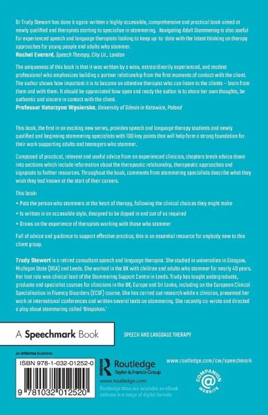 Despite stammering being a core part of Speech and Language Therapy training, the first steps into working with clients who stammer can be daunting. I well remember the anxiety before stepping into the waiting room to greet my first adult client who stammered. What if they ask me something I couldn't answer? Am I up to the job of this 'specialist' area? And, worst of all, what if my lack of experience makes their situation worse? In this book, Dr Trudy Stewart eases the transition into the world of working with adults who stammer by acknowledging these worries and providing clear and sensible steps forward.