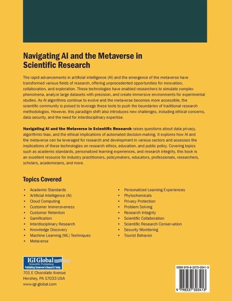 The rapid advancements in artificial intelligence (AI) and the emergence of the metaverse have transformed various fields of research, offering unprecedented opportunities for innovation, collaboration, and exploration. These technologies have enabled researchers to simulate complex phenomena, analyze large datasets with precision, and create immersive environments for experimental studies. As AI algorithms continue to evolve and the metaverse becomes more accessible, the scientific community is poised to leverage these tools to push the boundaries of traditional research methodologies. However, this paradigm shift also introduces new challenges, including ethical concerns, data security, and the need for interdisciplinary expertise. Navigating AI and the Metaverse in Scientific Research raises questions about data privacy, algorithmic bias, and the ethical implications of automated decision-making. It explores how AI and the metaverse can be leveraged for research and development in various sectors and assesses the implications of these technologies on research ethics, education, and public policy. Covering topics such as academic standards, personalized learning experiences, and research integrity, this book is an excellent resource for industry practitioners, policymakers, educators, professionals, researchers, scholars, academicians, and more.