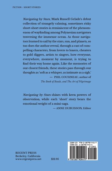 Navigating by the Stars, Mark Russell Gelade's debut collection of strangely calming, sometimes risky short-short stories is reminiscent of the phenomenon of wayfinding among Polynesian navigators traversing the immense ocean. As those navigators learned to sail by the stars, sun, and planets, so too does the author reveal, through a cast of compelling characters, from lovers to loners, cheaters to gold diggers, artists to singers, how everyone, everywhere, moment by moment, is trying to find their way home again. Like the memories of our closest friends, these stories pass through our thoughts as 'soft as a whisper, as intimate as a sigh.' - Phil Cousineau, author of The Book of Roads, and The Art of Pilgrimage