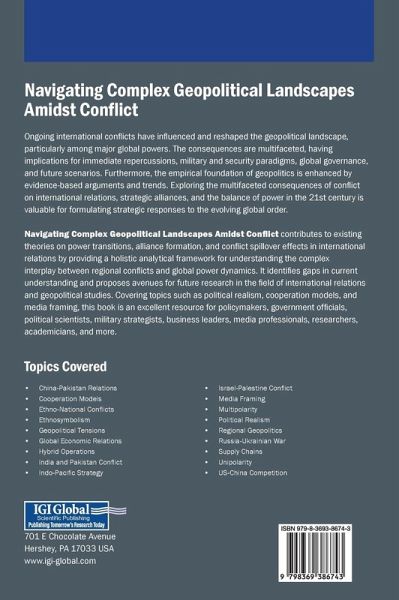 Ongoing international conflicts have influenced and reshaped the geopolitical landscape, particularly among major global powers. The consequences are multifaceted, having implications for immediate repercussions, military and security paradigms, global governance, and future scenarios. Furthermore, the empirical foundation of geopolitics is enhanced by evidence-based arguments and trends. Exploring the multifaceted consequences of conflict on international relations, strategic alliances, and the balance of power in the 21st century is valuable for formulating strategic responses to the evolving global order. Navigating Complex Geopolitical Landscapes Amidst Conflict contributes to existing theories on power transitions, alliance formation, and conflict spillover effects in international relations by providing a holistic analytical framework for understanding the complex interplay between regional conflicts and global power dynamics. It identifies gaps in current understanding and proposes avenues for future research in the field of international relations and geopolitical studies. Covering topics such as political realism, cooperation models, and media framing, this book is an excellent resource for policymakers, government officials, political scientists, military strategists, business leaders, media professionals, researchers, academicians, and more.