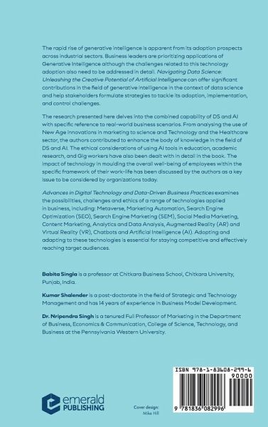 The rapid rise of generative intelligence is apparent from its adoption prospects across industrial sectors. Business leaders are prioritizing applications of Generative Intelligence although the challenges related to this technology adoption also need to be addressed in detail. Navigating Data Science: Unleashing the Creative Potential of Artificial Intelligence can offer significant contributions in the field of generative intelligence in the context of data science and help stakeholders formulate strategies to tackle its adoption, implementation, and control challenges. The research presented here delves into the combined capability of DS and AI with specific reference to real-world business scenarios. From analysing the use of New Age innovations in marketing to science and Technology and the Healthcare sector, the authors contributed to enhance the body of knowledge in the field of DS and AI. The ethical considerations of using AI tools in education, academic research, and Gig workers have also been dealt with in detail in the book. The impact of technology in moulding the overall well-being of employees within the specific framework of their work-life has been discussed by the authors as a key issue to be considered by organizations today. Advances in Digital Technology and Data-Driven Business Practices examines the possibilities, challenges and ethics of a range of technologies applied in business, including: Metaverse, Marketing Automation, Search Engine Optimization (SEO), Search Engine Marketing (SEM), Social Media Marketing, Content Marketing, Analytics and Data Analysis, Augmented Reality (AR) and Virtual Reality (VR), Chatbots and Artificial Intelligence (AI). Adopting and adapting to these technologies is essential for staying competitive and effectively reaching target audiences.