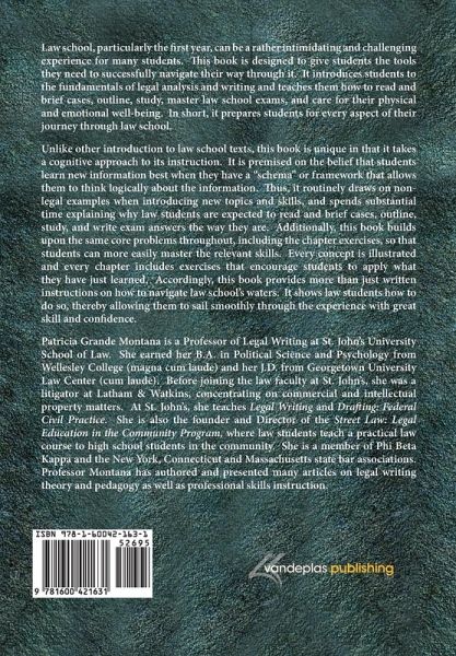 Law school, particularly the first year, can be a rather intimidating and challenging experience for many students. This book is designed to give students the tools they need to successfully navigate their way through it. It introduces students to the fundamentals of legal analysis and writing and teaches them how to read and brief cases, outline, study, master law school exams, and care for their physical and emotional well-being. In short, it prepares students for every aspect of their journey through law school. Unlike other introduction to law school texts, this book is unique in that it takes a cognitive approach to its instruction. It is premised on the belief that students learn new information best when they have a "schema" or framework that allows them to think logically about the information. Thus, it routinely draws on non-legal examples when introducing new topics and skills, and spends substantial time explaining why law students are expected to read and brief cases, outline, study, and write exam answers the way they are. Additionally, this book builds upon the same core problems throughout, including the chapter exercises, so that students can more easily master the relevant skills. Every concept is illustrated and every chapter includes exercises that encourage students to apply what they have just learned. Accordingly, this book provides more than just written instructions on how to navigate law school's waters. It shows law students how to do so, thereby allowing them to sail smoothly through the experience with great skill and confidence. Patricia Grande Montana is a Professor of Legal Writing at St. John's University School of Law. She earned her B.A. in Political Science and Psychology from Wellesley College (magna cum laude) and her J.D. from Georgetown University Law Center (cum laude). Before joining the law faculty at St. John's, she was a litigator at Latham & Watkins, concentrating on commercial and intellectual property matters. At St. John's, she teaches Legal Writing and Drafting: Federal Civil Practice. She is also the founder and Director of the Street Law: Legal Education in the Community Program, where law students teach a practical law course to high school students in the community. She is a member of Phi Beta Kappa and the New York, Connecticut and Massachusetts state bar associations. Professor Montana has authored and presented many articles on legal writing theory and pedagogy as well as professional skills instruction.
