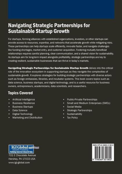 For startups, forming alliances with established organizations, investors, or other startups can provide access to resources, expertise, and networks that accelerate growth while mitigating risks. These partnerships can help startups scale efficiently, innovate faster, and navigate challenges like funding shortages, market entry, and customer acquisition. Fostering mutually beneficial relationships requires careful planning, clear communication, and a shared vision for sustainability. As startups aim for long-term impact alongside profitability, strategic partnerships are key to creating resilient, sustainable businesses that can thrive in today's markets. Navigating Strategic Partnerships for Sustainable Startup Growth delves into the critical role of the innovation ecosystem in supporting startups as they navigate the complexities of sustainable growth. It explores strategies for building strategic partnerships with diverse actors such as foreign embassies, libraries, and incubator systems. This book covers topics such as data science, business startups, and digital technology, and is a useful resource for business owners, entrepreneurs, academicians, data scientists, and researchers.