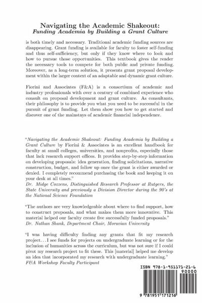 "Navigating the Academic Shakeout: Funding Academia by Building a Grant Culture" is both timely and necessary. Traditional academic funding sources are disappearing. Grant funding is available for faculty to foster self-funding and thus self-sufficiency, but only if they know where to look and how to pursue those opportunities. This textbook gives the reader the necessary tools to compete for both public and private funding. Moreover, as a long-term solution, it presents grant proposal development within the larger context of an adaptable and dynamic grant culture. Fiorini and Associates (F&A) is a consortium of academic and industry professionals with over a century of combined experience who consult on proposal development and grant culture. As consultants, their philosophy is to provide you what you need to be successful in the pursuit of grant funding. Let them show you how to get started and discover one of the mainstays of academic financial independence.