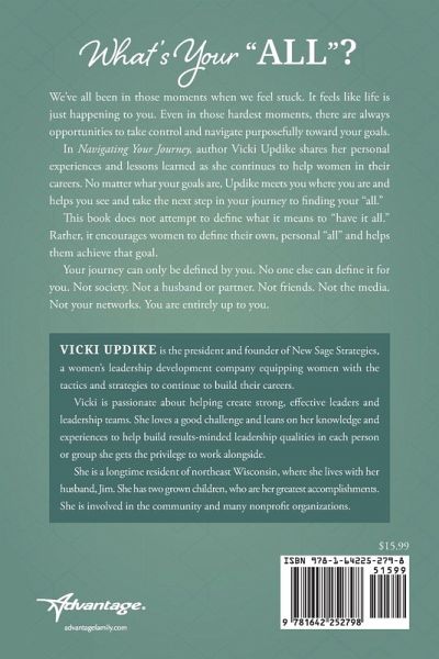 What's Your "ALL"? We've all been in those moments when we feel stuck. It feels like life is just happening to you. Even in those hardest moments, there are always opportunities to take control and navigate purposefully toward your goals. In Navigating Your Journey, author Vicki Updike shares her personal experiences and lessons learned as she continues to help women in their careers. No matter what your goals are, Updike meets you where you are and helps you see and take the next step in your journey to finding your "all." This book does not attempt to define what it means to "have it all." Rather, it encourages women to define their own, personal "all" and helps them achieve that goal. Your journey can only be defined by you. No one else can define it for you. Not society. Not a husband or partner. Not friends. Not the media. Not your networks. You are entirely up to you.