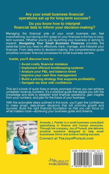 Are your small business financial operations set up for long-term success? Do you know how to interpret financial data to inform your decision-making? Managing the financial side of your small business can feel overwhelming, but having a firm grasp on your finances is the key to long-term success. Whether you're just launching your business or aiming to expand, Navigating Your Small Business Finances provides the essential tools you need to effectively track, manage, and interpret your finances. From data entry to decision-making, this comprehensive guide simplifies complex financial processes for small business owners. Inside, you'll discover how to:Avoid costly financial mistakes Implement efficient bookkeeping systems Analyze your P&L and balance sheet Improve your cash flow management Build a pricing strategy that supports profitability Navigate tax time with confidence This isn't a book of quick fixes or empty promises of how you can achieve unrealistic revenue numbers. It's a practical guide that equips you with the knowledge and skills to establish solid financial operations, gain insights from your numbers, and plan for the future of your business. With the actionable steps outlined in this book, you'll gain the confidence to make smart, data-driven decisions that will promote growth and success. Build the right financial foundation so that you can focus on what matters most-achieving your business goals and dreams.