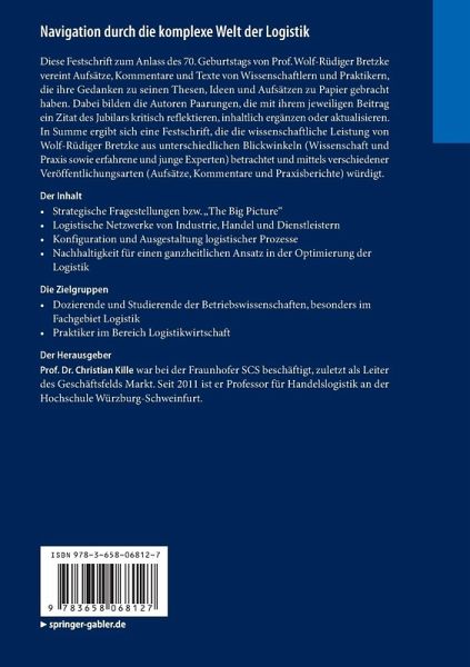 Kontinuierlich hat Prof. Bretzke die Logistik mittels scharfsinnigen, kritischen und fundierten Büchern, Artikeln, Vorträgen und Kommentaren zu aktuellen Themen bereichert. Dies belegen seine über 200 Fachpublikationen. Er brachte wertvolle Impulse in die Diskussion um Trends und Managementmethoden, Effizienzsteigerung und Nachhaltigkeit sowie Gestaltung logistischer Netzwerke. Diese Themen bilden auch den Rahmen der Festschrift zum Anlass des 70. Geburtstags von Wolf-Rüdiger Bretzke. Es haben sich Wissenschaftler und Praktiker zusammengefunden, um ihre Gedanken und Ideen zu den Tätigkeitsbereichen von Wolf-Rüdiger Bretzke mitzuteilen. Dabei bilden Wissenschaftler und Praktiker eine Paarung, die mit ihrem jeweiligen Beitrag ein Zitat aus den zahlreichen Veröffentlichungen von Wolf-Rüdiger Bretzke kritisch reflektieren, inhaltlich ergänzen oder aktualisieren. In Summe ergibt sich eine Festschrift, die vor der wissenschaftlichen Leistung von Wolf-Rüdiger Bretzke den Hut zieht, die Gedanken kritisch reflektieren und durch unterschiedliche Blickwinkel, nämlich durch Wissenschaft und Praxis sowie erfahrene und junge Experten, betrachten soll. Das Ergebnis ist eine Sammlung unterschiedlichster Formen von Veröffentlichungen. So finden sich in dieser Festschrift klassische Artikel und Kommentare sowie wissenschaftlicher Praxisberichte und praxisorientierte Wissenschaftsaufsätze.