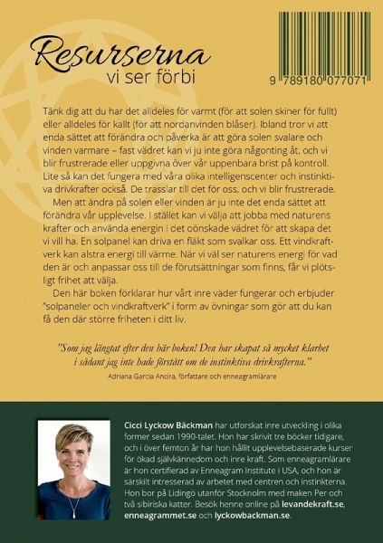 Den här boken lär dig skilja mellan tankar, känslor och instinktiva impulser. Ofta blandar vi ihop dem, vilket inte sällan leder till förvirring, frustration och inre eller yttre konflikter. Lika ofta försöker vi förneka, undertrycka eller frisera vår inre upplevelse, vilket också leder till problem. Men problemen och konflikterna uppstår bara för att vi inte har lärt oss möta och hantera dessa olika intryck för vad de är. Det är som om vi hade det alldeles för varmt (för att solen skiner för fullt) eller alldeles för kallt (om nordanvinden blåser) - och så tror vi att enda sättet att förändra och påverka är att göra solen svalare och vinden varmare. Men i stället kan vi välja att jobba med naturens krafter och använda energin i det oönskade vädret för att skapa det vi vill ha. En solpanel kan driva en fläkt som svalkar oss. Ett vindkraftverk kan alstra energi till värme. När vi väl ser naturens energi för vad den är och anpassar oss till de förutsättningar som finns får vi plötsligt frihet att välja. Lite så fungerar det med våra intelligenscenter och instinktiva drivkrafter också. Med den här boken vill jag göra två saker: dels förklara hur "vädret" inom oss fungerar, dels erbjuda "solpaneler och vindkraftverk" i form av övningar som gör att du kan få den där större friheten i ditt liv. Boken kom till för att fylla ett tomrum i litteraturen kring Enneagrammets personlighetstypologi, men den är precis lika tillgänglig för dig som inte känner till eller är intresserad av personlighetstyperna. Med tydliga förklaringar, levande exempel och praktiska övningar får läsaren en förstahandsupplevelse av de inre resurser som tas upp, och guidas och steg för steg på vägen mot ett liv i större närvaro, medvetenhet och frihet.