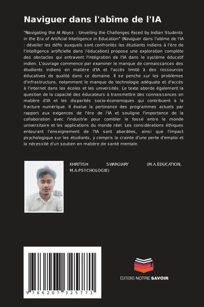 "Navigating the AI Abyss : Unveiling the Challenges Faced by Indian Students in the Era of Artificial Intelligence in Education" (Naviguer dans l'abîme de l'IA : dévoiler les défis auxquels sont confrontés les étudiants indiens à l'ère de l'intelligence artificielle dans l'éducation) propose une exploration complète des obstacles qui entravent l'intégration de l'IA dans le système éducatif indien. L'ouvrage commence par examiner le manque de connaissances des étudiants indiens en matière d'IA et l'accès limité à des ressources éducatives de qualité dans ce domaine. Il se penche sur les problèmes d'infrastructure, notamment le manque de technologie adéquate et d'accès à l'internet dans les écoles et les universités. Le texte aborde également la question de la capacité des éducateurs à transmettre des connaissances en matière d'IA et les disparités socio-économiques qui contribuent à la fracture numérique. Il évalue la pertinence des programmes actuels par rapport aux exigences de l'ère de l'IA et souligne l'importance de la collaboration avec l'industrie pour combler le fossé entre le monde universitaire et les applications du monde réel. Les considérations éthiques entourant l'enseignement de l'IA sont abordées, ainsi que l'impact psychologique sur les étudiants, y compris la crainte d'une perte d'emploi et la nécessité d'un soutien en matière de santé mentale.