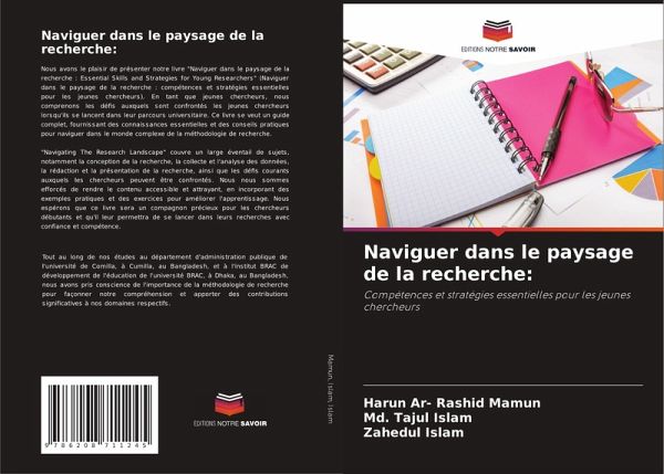 Nous avons le plaisir de présenter notre livre "Naviguer dans le paysage de la recherche : Essential Skills and Strategies for Young Researchers" (Naviguer dans le paysage de la recherche : compétences et stratégies essentielles pour les jeunes chercheurs). En tant que jeunes chercheurs, nous comprenons les défis auxquels sont confrontés les jeunes chercheurs lorsqu'ils se lancent dans leur parcours universitaire. Ce livre se veut un guide complet, fournissant des connaissances essentielles et des conseils pratiques pour naviguer dans le monde complexe de la méthodologie de recherche."Navigating The Research Landscape" couvre un large éventail de sujets, notamment la conception de la recherche, la collecte et l'analyse des données, la rédaction et la présentation de la recherche, ainsi que les défis courants auxquels les chercheurs peuvent être confrontés. Nous nous sommes efforcés de rendre le contenu accessible et attrayant, en incorporant des exemples pratiques et des exercices pour améliorer l'apprentissage. Nous espérons que ce livre sera un compagnon précieux pour les chercheurs débutants et qu'il leur permettra de se lancer dans leurs recherches avec confiance et compétence.