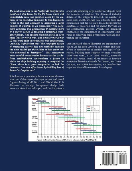 The next naval war in the Pacific will likely involve significant ship losses for the US Navy, which will immediately raise the question asked by the authors in the Executive Summary to this document: "what is the best approach to acquiring a large number of warships in an emergency?" The document compares two approaches: 1) building more of a proven design 2) building a simplified emergency design. The authors examine a total of 1,345 ships (327 for World War I and 1,018 for World War II) that were built in response to war emergencies. Crucially, it finds that that "the simplified design of emergency escorts does not markedly decrease the time needed for those ships to first enter service compared to destroyers." This assessment bears careful consideration because as the US defense establishment contemplates a future in which its ship building capacity is outpaced by China, there is a great temptation to look for shortcuts: "we can offset losses by building lots of drones" or "replicators." This document provides information about the construction of destroyers, destroyer escorts, and patrol frigates during World War I and World War II. It discusses the strategic background, design decisions, construction challenges, and the importance of quickly producing large numbers of ships to meet the demands of wartime. The document includes details on the shipyards involved, the number of ships built, and the average time it took to build and commission each type of ship. It also highlights the shortages of materials and the impact they had on the construction process. Overall, the document emphasizes the significance of experienced shipyards in achieving rapid production rates and supporting the war effort. This annotated edition illustrates the capabilities of the AI Lab for Book-Lovers to add context and ease-of-use to manuscripts. It includes five types of abstracts, building from simplest to more complex: TLDR (one word), ELI5, TLDR (vanilla), Scientific Style, and Action Items; three essays to increase viewpoint diversity: Grounds for Dissent, Red Team Critique, and MAGA Perspective; and Notable Passages and Nutshell Summaries for each page.