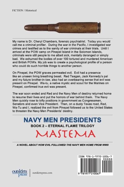 The adventure continues in NAVY MEN PRESIDENTS: Book 2-Eternal Flame Trilogy-Mastema! Jack Kennedy's true best friend, Red Teagan, continues his cautionary tale describing the Navy Men Presidents Post-war political battles and hijinks. When two of Jack's campaign team are murdered, Red realizes the evil he sensed on a remote Pacific island during World War II has followed him home. He reaches out to his network of WW II veterans across the world to combat a serial killer the likes never seen before or since, Mastema. Using pioneering forensics and psychological profiling, these veterans from the war in the Pacific realize they are in a race against time to stop Mastema from striking again. Mastema plans to take out the royal family and other world leaders including the Navy Men Presidents at the queen's coronation. Ed Delker has written a revisionist history perfect for baby boomers and others interested in midtwentieth-century events. The second NAVY MEN PRESIDENTS is great as a sequel to book one, but it can also stand alone, allowing readers to skip the war stories and go straight for the thrill of a different kind of battle.