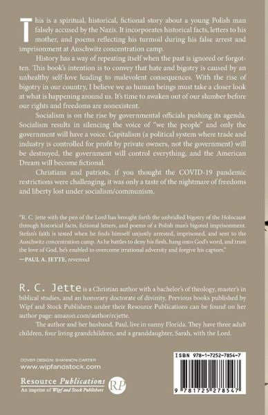 This is a spiritual, historical, fictional story about a young Polish man falsely accused by the Nazis. It incorporates historical facts, letters to his mother, and poems reflecting his turmoil during his false arrest and imprisonment at Auschwitz concentration camp. History has a way of repeating itself when the past is ignored or forgotten. This book's intention is to convey that hate and bigotry is caused by an unhealthy self-love leading to malevolent consequences. With the rise of bigotry in our country, I believe we as human beings must take a closer look at what is happening around us. It's time to awaken out of our slumber before our rights and freedoms are nonexistent. Socialism is on the rise by governmental officials pushing its agenda. Socialism results in silencing the voice of ""we the people"" and only the government will have a voice. Capitalism (a political system where trade and industry is controlled for profit by private owners, not the government) will be destroyed, the government will control everything, and the American Dream will become fictional. Christians and patriots, if you thought the COVID-19 pandemic restrictions were challenging, it was only a taste of the nightmare of freedoms and liberty lost under socialism/communism.