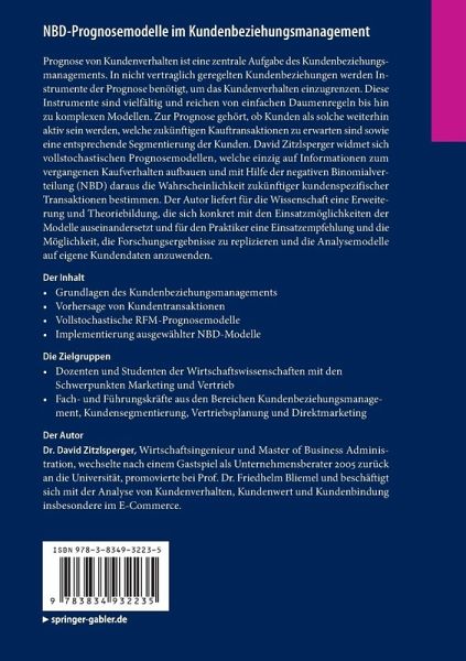 Prognose von Kundenverhalten ist eine zentrale Aufgabe des Kundenbeziehungsmanagements. In nicht vertraglich geregelten Kundenbeziehungen werden Instrumente der Prognose benötigt, um das Kundenverhalten einzugrenzen. Diese Instrumente sind vielfältig und reichen von einfachen Daumenregeln bis hin zu komplexen Modellen. Zur Prognose gehört, ob Kunden als solche weiterhin aktiv sein werden, welche zukünftigen Kauftransaktionen zu erwarten sind sowie eine entsprechende Segmentierung der Kunden. David Zitzlsperger widmet sich vollstochastischen Prognosemodellen, welche einzig auf Informationen zum vergangenen Kaufverhalten aufbauen und mit Hilfe der negativen Binomialverteilung (NBD) daraus die Wahrscheinlichkeit zukünftiger kundenspezifischer Transaktionen bestimmen. Der Autor liefert für die Wissenschaft eine Erweiterung und Theoriebildung, die sich konkret mit den Einsatzmöglichkeiten der Modelle auseinandersetzt und für den Praktiker eine Einsatzempfehlung und die Möglichkeit dieForschungsergebnisse zu replizieren und die Analysemodelle auf eigene Kundendaten anzuwenden.