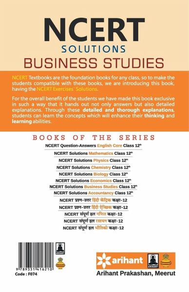 Around 19 boards across 14 states follow NCERT textbooks as chief teaching-learning resource. Thereby, these books become immensely significant study resource for school students in our country. Our NCERT Solutions Series aims to enhance the thinking and learning abilities of students by Explanatory Solutions. The questions have been grouped in sets of Chapter End exercises along with Selected NCERT Exemplar Problems. Business Studies for class 12th covers the syllabus Entire syllabus has been divided into 13 Chapters. Each chapter includes Quick Reading Notes, Formulas, Important Results, Equations, Definitions, Key words, Important Points to ensure complete mastery over various topic of NCERT. Table of ContentPart A-Nature and Significance of Management, Principles of Management, Business Environment, Planning, Organizing, staffing, Directing, Controlling Part B- Financial Management, Financial Market, Marketing, Consumer Protection, Entrepreneurship Development