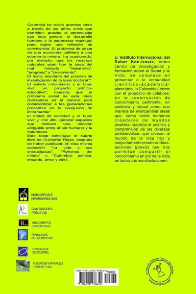 Colombia ha vivido grandes crisis a través de los años; crisis que permiten, gracias al aprendizaje que ésta genera, el desarrollo humano y la esperanza espiritual para lograr una reflexión en la convivencia. El problema de pasar de una economía cafetera a una economía minera ha ocasionado, por ejemplo, que los recursos naturales sean hoy la base del mal llamado "desarrollo", "progreso" y "crecimiento". El texto, resultado del proceso de investigación de la tesis doctoral "El estado colombiano y el buen vivir, un proyecto político-educativo", muestra que el problema social de esta crisis civilizatoria es el camino para conscientizar las generaciones presentes, en la búsqueda de incrementar el índice de Felicidad y el Buen Vivir y, con ello, generar espacios que motiven una relación amigable entre el ser humano y la naturaleza. Este texto constituye su cuarto libro después de: "La vida y sus encrucijadas", "Rehenes del miedo" y "Colombia: política, encanto, amor y odio".