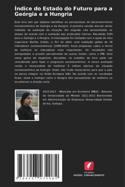 Este livro tem por objetivo identificar as perspectivas de desenvolvimento socioeconómico da Geórgia e da Hungria. A primeira secção discute vários métodos de avaliação da situação. Em seguida, são apresentadas as etapas de acordo com a avaliação das projecções futuras, Resultado SOFI para a Geórgia e a Hungria. A investigação foi realizada com a ajuda do meu supervisor Bartha Zoltan, a fim de obter uma avaliação global de 26 indicadores socioeconómicos (1999-2025). Inclui propostas sobre a forma de melhorar os indicadores mais importantes. Os resultados são extrapolados e provêm parcialmente de outras fontes, como o FMI. Uma vasta gama de espectros discutidos no trabalho do livro pode ser considerada para fazer o progresso socioeconómico. A nossa avaliação revela a necessidade de melhorar 6 índices básicos da situação socioeconómica da Geórgia. Estes são muito necessários para que o país se possa integrar na União Europeia (UE). De acordo com os resultados finais, tanto a Geórgia como a Hungria têm perspectivas de melhoria se escolherem a direção certa.