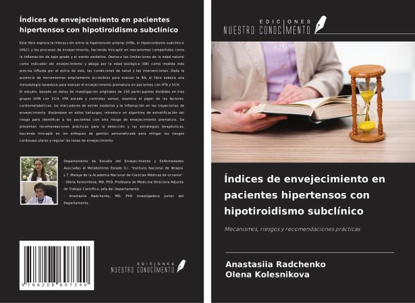 Este libro explora la interacción entre la hipertensión arterial (HTA), el hipotiroidismo subclínico (HSC) y los procesos de envejecimiento, haciendo hincapié en mecanismos compartidos como la inflamación de bajo grado y el estrés oxidativo. Destaca las limitaciones de la edad natural como indicador del envejecimiento y aboga por la edad biológica (EB) como medida más precisa influida por el estilo de vida, las condiciones de salud y las intervenciones. Dada la ausencia de herramientas ampliamente accesibles para evaluar la BA, el libro esboza una metodología novedosa para evaluar el envejecimiento prematuro en pacientes con HTA y SCH.El estudio, basado en datos de investigación originales de 150 participantes divididos en tres grupos (HTA con SCH, HTA aislada y controles sanos), examina el papel de los factores cardiometabólicos, los marcadores de estrés oxidativo y la inflamación en las trayectorias de envejecimiento. Basándose en estos hallazgos, introduce un algoritmo de estratificación del riesgo para identificar a los pacientes con alto riesgo de envejecimiento prematuro. Se presentan recomendaciones prácticas para la detección y las estrategias terapéuticas, haciendo hincapié en los enfoques de gestión personalizada para mitigar los riesgos cardiovasculares y regular las tasas de envejecimiento.