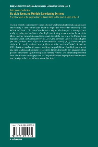 The aim of the book is to resolve the question of whether multiple sanctioning systems are contrary to the ne bis in idem under the regulation provided by Protocol 7 to the ECHR and the EU Charter of Fundamental Rights. The first part is a comparative study regarding the lawfulness of multiple sanctioning systems under the ne bis in idem, studying the evolution and the current state of the case law of the United States Supreme Court, the Canadian Supreme Court, the European Court of Human Rights (ECtHR), and the Court of Justice of the European Union (CJEU). The second part of the book critically analyses three problems with the case law of the ECtHR and the CJEU. Part three deals with reconceptualizing the prohibition of multiple punishment and the prohibition of multiple prosecutions. Finally, the fourth part addresses other possible protections against multiple sanctioning systems. Two other safeguards that limit multiple sanctioning systems are the prohibition of disproportionate sanctions and the right to be tried within a reasonable time.