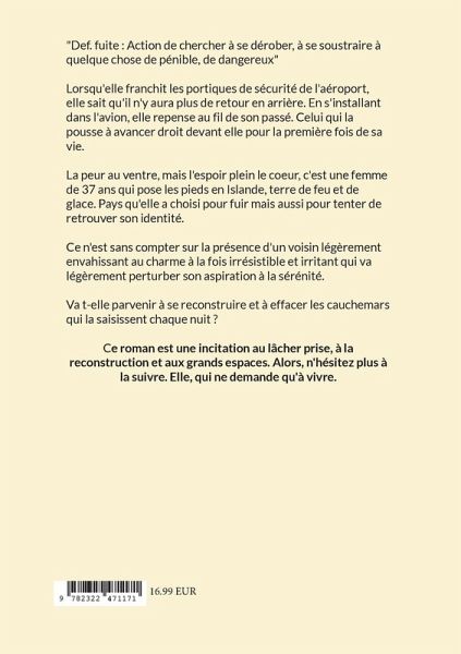 "Def. fuite : Action de chercher à se dérober, à se soustraire à quelque chose de pénible, de dangereux"Lorsqu'elle franchit les portiques de sécurité de l'aéroport, elle sait qu'il n'y aura plus de retour en arrière. En s'installant dans l'avion, elle repense au fil de son passé. Celui qui la pousse à avancer droit devant elle pour la première fois de sa vie.La peur au ventre, mais l'espoir plein le coeur, c'est une femme de 37 ans qui pose les pieds en Islande, terre de feu et de glace. Pays qu'elle a choisi pour fuir mais aussi pour tenter de retrouver son identité.Ce n'est sans compter sur la présence d'un voisin légèrement envahissant au charme à la fois irrésistible et irritant qui va légèrement perturber son aspiration à la sérénité. Va t-elle parvenir à se reconstruire et à effacer les cauchemars qui la saisissent chaque nuit ? Ce roman est une incitation au lâcher prise, à la reconstruction et aux grands espaces. Alors, n'hésitez plus à la suivre. Elle, qui ne demande qu'à vivre.