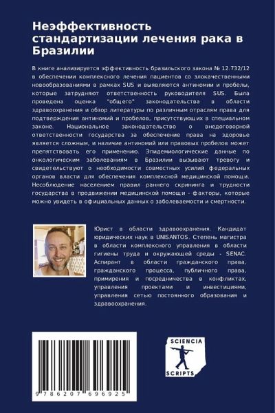 V knige analiziruetsq äffektiwnost' brazil'skogo zakona ¿ 12.732/12 w obespechenii komplexnogo lecheniq pacientow so zlokachestwennymi nowoobrazowaniqmi w ramkah SUS i wyqwlqütsq antinomii i probely, kotorye zatrudnqüt otwetstwennost' rukowoditelq SUS. Byla prowedena ocenka "obschego" zakonodatel'stwa w oblasti zdrawoohraneniq i obzor literatury po razlichnym otraslqm prawa dlq podtwerzhdeniq antinomij i probelow, prisutstwuüschih w special'nom zakone. Nacional'noe zakonodatel'stwo o wnedogowornoj otwetstwennosti gosudarstwa za obespechenie prawa na zdorow'e qwlqetsq slozhnym, i nalichie antinomij ili prawowyh probelow mozhet prepqtstwowat' ego primeneniü. Jepidemiologicheskie dannye po onkologicheskim zabolewaniqm w Brazilii wyzywaüt trewogu i swidetel'stwuüt o neobhodimosti sowmestnyh usilij federal'nyh organow wlasti dlq obespecheniq komplexnoj medicinskoj pomoschi. Nesoblüdenie naseleniem prawil rannego skrininga i trudnosti gosudarstwa w prodwizhenii medicinskoj pomoschi - faktory, kotorye mozhno uwidet' w oficial'nyh dannyh o zabolewaemosti i smertnosti.