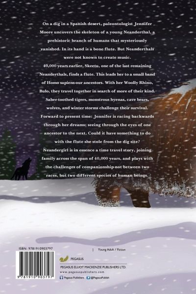 On a dig in a Spanish desert, archeologist, Jennifer Moore uncovers the skeleton of a young Neanderthal, a prehistoric branch of humans that mysteriously vanished. In its hand is a bone flute. But Neanderthals were not known to create music. 40,000 years earlier, Skeetu, one of the last remaining Neanderthals, finds a flute. This leads her to a small band of Homo sapiens-our ancestors. With her Woolly Rhino, Bulo, they travel together in search of more of their kind. Saber-toothed tigers, monstrous hyenas, cave bears, wolves, and winter storms challenge their survival. Forward to present time: Jennifer is racing backwards through her dreams; seeing through the eyes of one ancestor to the next. Could it have something to do with the flute she stole from the dig site? Neandergirl is in essence a time travel story, joining family across the span of 40,000 years, and plays with the challenges of companionship-not between two races, but two different species of human beings.