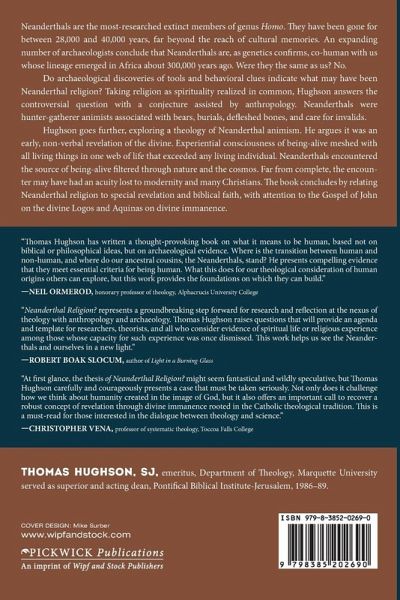 Neanderthals are the most-researched extinct members of genus Homo. They have been gone for between 28,000 and 40,000 years, far beyond the reach of cultural memories. An expanding number of archaeologists conclude that Neanderthals are, as genetics confirms, co-human with us whose lineage emerged in Africa about 300,000 years ago. Were they the same as us? No. Do archaeological discoveries of tools and behavioral clues indicate what may have been Neanderthal religion? Taking religion as spirituality realized in common, Hughson answers the controversial question with a conjecture assisted by anthropology. Neanderthals were hunter-gatherer animists associated with bears, burials, defleshed bones, and care for invalids. Hughson goes further, exploring a theology of Neanderthal animism. He argues it was an early, non-verbal revelation of the divine. Experiential consciousness of being-alive meshed with all living things in one web of life that exceeded any living individual. Neanderthals encountered the source of being-alive filtered through nature and the cosmos. Far from complete, the encounter may have had an acuity lost to modernity and many Christians. The book concludes by relating Neanderthal religion to special revelation and biblical faith, with attention to the Gospel of John on the divine Logos and Aquinas on divine immanence.