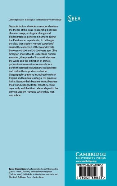 Neanderthals and Modern Humans develops the theme of the close relationship between climate change, ecological change and biogeographical patterns in humans during the Pleistocene. In particular, it challenges the view that Modern Human 'superiority' caused the extinction of the Neanderthals between 40 and 30 thousand years ago. Clive Finlayson shows that to understand human evolution, the spread of humankind across the world and the extinction of archaic populations, we must move away from a purely theoretical evolutionary ecology base and realise the importance of wider biogeographic patterns including the role of tropical and temperate refugia. His proposal is that Neanderthals became extinct because their world changed faster than they could cope with, and that their relationship with the arriving Modern Humans, where they met, was subtle.