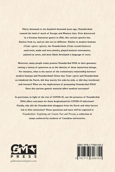 Thirty thousand to two hundred thousand years ago, Neanderthals roamed the land of much of Europe and Western Asia. First discovered in a German limestone quarry in 1856, this curious species was distinct from us, and yet also not so different. Similar to modern humans (Homo sapiens sapiens), the Neanderthals (Homo neanderthalensis) used tools, made and wore jewelry, played musical instruments, painted in caves, and most likely developed a language of sorts. Moreover, many people today possess Neanderthal DNA in their genomes, raising a variety of questions as to the identity of these mysterious beings. For instance, what is the nature of the evolutionary relationship between modern humans and Neanderthals? Given that Homo sapiens and Neanderthals co-inhabited the Earth, did they merely live side-by-side, or did they interbreed and interact? What are the implications of possessing Neanderthal DNA? Does this ancient genetic material affect medical outcomes? In particular, in light of the rise of COVID-19, can the presence of Neanderthal DNA affect outcomes for those hospitalized for COVID-19 infections? Finally, why did the Neanderthals disappear from the Earth and what factors led to their extinction? These questions and more will be explored in Neanderthals: Exploring our Genetic Past and Present, a collection of essays authored by students of Canadian universities.
