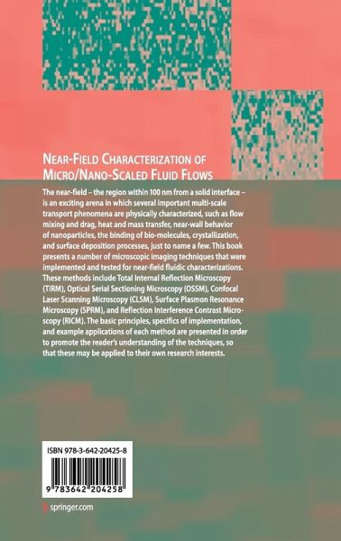 The near-field - the region within 100 nm from a solid interface - is an exciting arena in which several important multi-scale transport phenomena are physically characterized, such as flow mixing and drag, heat and mass transfer, near-wall behavior of nanoparticles, the binding of bio-molecules, crystallization, and surface deposition processes, just to name a few. This book presents a number of microscopicimaging techniques that were implemented and tested for near-field fluidic characterizations. These methods include Total Internal Reflection Microscopy (TIRM), Optical Serial Sectioning Microscopy (OSSM), Confocal Laser Scanning Microscopy (CLSM), Surface Plasmon Resonance Microscopy (SPRM), and Reflection Interference Contrast Microscopy (RICM). The basic principles, specifics of implementation, and example applications of each method are presented in order to promote the reader's understanding of the techniques, so that these may be applied to their own research interests.