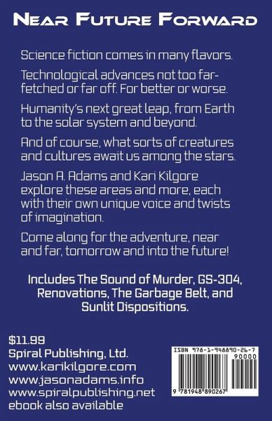 Science fiction comes in many flavors. Technological advances not too far-fetched or far off. For better or worse. Humanity's next great leap, from Earth to the solar system and beyond. And of course, what sorts of creatures and cultures await us among the stars. Jason A. Adams and Kari Kilgore explore these areas and more, each with their own unique voice and twists of imagination. Come along for the adventure, near and far, tomorrow and into the future! Includes The Sound of Murder, GS-304, Renovations, The Garbage Belt, and Sunlit Dispositions. The Sound of Murder Self-improvement can be deadly. Insurance agency programmer Dana Sanderson only wants peace and quiet at work. A desire her micromanaging boss somehow never respects. Then the investigation of a rash of suspicious natural death claims lands on Dana's laptop. Failure means huge payouts for the company. Success means a huge bonus for her. Find out if Dana's risks outweigh her rewards in this clever digital mystery. GS-304 Mighty explorers of the galaxy Portarr and Flandarr inspect a non-descript watery planet in G-Sector. What they discover changes their lives. GS-304, the specimen that refuses to be a subject. Join the intrepid adventurers as they discover a strange beast that conquers their hearts. Renovations Bob Henderson despises the modern world. Talking elevators. Automated cars. Smart phones that track every move, mood, and thought. The day his office building grows security cameras in the halls, Bob realizes the modern world might despise him right back. What happens when the network decides to search for itself? The Garbage Belt Looking for humans? Just look for the garbage. From bones to plastic to dead electronics, people rarely manage to clean up after themselves. Humanity takes a long time to learn how to manage limited resources, too. The rare and precious get lost with the useless and plentiful. Meet Gayle Simmons, pilot of the Treasure Hunt. Rare and precious, in her sights. Sunlit Dispositions Sometimes, only Alex will do. A space station just exploded, and the Sunlit Spirit Empire calls in Alex, Free Troubleshooter extraordinaire. No last name needed. Alex wades into the strange world of Sunlit Spirit intrigue, gamma blaster in hand. Join Alex as he learns the deceptions behind the Truth.