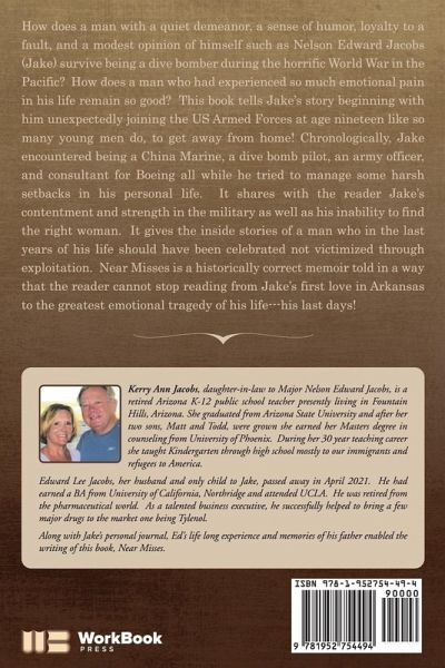 How does a man with a quiet demeanor, a sense of humor, loyalty to a fault, and a modest opinion of himself such as Nelson Edward Jacobs (Jake) survive being a dive bomber during the horrific World War in the Pacific? How does a man who had experienced so much emotional pain in his life remain so good? This book tells Jake's story beginning with him unexpectedly joining the US Armed Forces at age nineteen like so many young men do, to get away from home! Chronologically, Jake encountered being a China Marine, a dive bomb pilot, an army officer, and consultant for Boeing all while he tried to manage some harsh setbacks in his personal life. It shares with the reader Jake's contentment and strength in the military as well as his inability to find the right woman. It gives the inside stories of a man who in the last years of his life should have been celebrated not victimized through exploitation. Near Misses is a historically correct memoir told in a way that the reader cannot stop reading from Jake's first love in Arkansas to the greatest emotional tragedy of his life---his last days!
