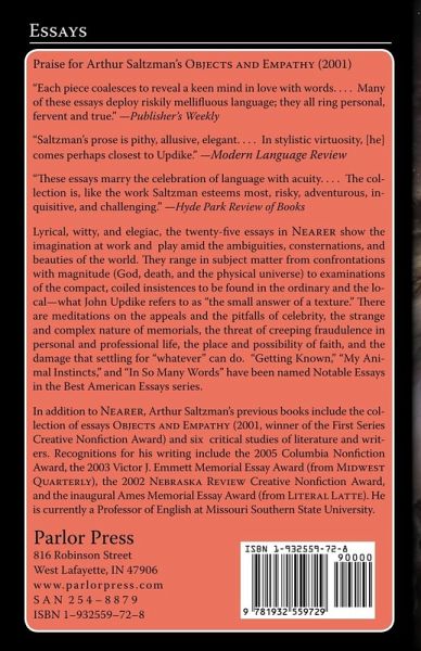 Lyrical, witty, and elegiac, the twenty-five essays in NEARER show the imagination at work and play amid the ambiguities, consternations, and beauties of the world. They range in subject matter from confrontations with magnitude (God, death, and the physical universe) to examinations of the compact, coiled insistences to be found in the ordinary and the local-what John Updike refers to as "the small answer of a texture." There are meditations on the appeals and the pitfalls of celebrity, the strange and complex nature of memorials, the threat of creeping fraudulence in personal and professional life, the place and possibility of faith, and the damage that settling for "whatever" can do. "Getting Known," "My Animal Instincts," and "In So Many Words" have been named Notable Essays in the Best American Essays series. About the Author In addition to NEARER, Arthur Saltzman's previous books include the collection of essays OBJECTS AND EMPATHY (2001, winner of the First Series Creative Nonfiction Award) and six critical studies of literature and writers. Recognitions for his writing include the 2005 Columbia Nonfiction Award, the 2003 Victor J. Emmett Memorial Essay Award (from MIDWEST QUARTERLY), the 2002 NEBRASKA REVIEW Creative Nonfiction Award, and the inaugural Ames Memorial Essay Award (from LITERAL LATTE). He is currently a Professor of English at Missouri Southern State University