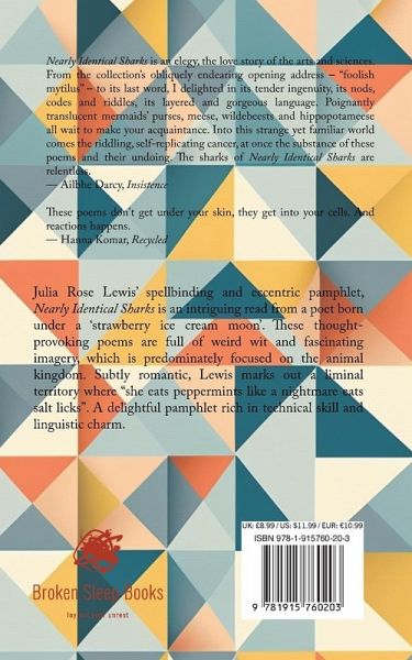 Julia Rose Lewis' spellbinding and eccentric pamphlet, Nearly Identical Sharks is an intriguing read from a poet born under a 'strawberry ice cream moon'. These thought-provoking poems are full of weird wit and fascinating imagery, which is predominately focused on the animal kingdom. Subtly romantic, Lewis marks out a liminal territory where "she eats peppermints like a nightmare eats salt licks". A delightful pamphlet rich in technical skill and linguistic charm.