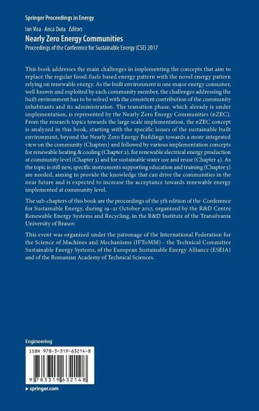 This book addresses the main challenges in implementing the concepts that aim to replace the regular fossil-fuels based energy pattern with the novel energy pattern relying on renewable energy. As the built environment is one major energy consumer, well known and exploited by each community member, the challenges addressing the built environment has to be solved with the consistent contribution of the community inhabitants and its administration. The transition phase, which already is under implementation, is represented by the Nearly Zero Energy Communities (nZEC). From the research topics towards the large scale implementation, the nZEC concept is analyzed in this book, starting with the specific issues of the sustainable built environment, beyond the Nearly Zero Energy Buildings towards a more integrated view on the community (Chapter1) and followed by various implementation concepts for renewable heating & cooling (Chapter 2), for renewable electrical energy production at communitylevel (Chapter 3) and for sustainable water use and reuse (Chapter 4). As the topic is still new, specific instruments supporting education and training (Chapter 5) are needed, aiming to provide the knowledge that can drive the communities in the near future and is expected to increase the acceptance towards renewable energy implemented at community level.