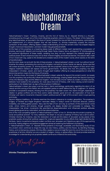 Nebuchadnezzar's Dream Nebuchadnezzar's Dream by Dr. Maxwell Shimba is a thought-provoking journey through one of the most influential prophetic visions in history. The dream of the Babylonian king Nebuchadnezzar, as recorded in the Book of Daniel, foretells the rise and fall of world empires, culminating in the establishment of a divine kingdom that will last forever. Dr. Shimba masterfully unpacks the intricate symbolism of this dream, offering readers a deep understanding of how this ancient vision has shaped religious thought, historical interpretation, and even modern-day geopolitical beliefs. At the heart of the prophecy is a towering statue made of different metals-each representing a succession of empires, starting with Babylon and moving through Medo-Persia, Greece, Rome, and beyond. Dr. Shimba explores the profound significance of these metals, revealing how they not only represent the material strength and political power of each empire but also hint at their inherent fragility and eventual demise. The statue's feet, made of iron mixed with clay, speak to the divided and unstable nature of the modern world, which stands on the brink of transformation. But the vision does not end with the fall of these empires. In Nebuchadnezzar's dream, a rock "cut without hands" smashes the statue, symbolizing the coming of a kingdom not built by human hands-an eternal, divine rule that will outlast all earthly powers. Dr. Shimba expertly ties this prophetic climax to the Kingdom of God, which many religious traditions believe will replace all human governments. He delves into how this prophecy has been interpreted in Christian, Jewish, and Islamic thought, each tradition offering its unique perspective on what this divine intervention means for the future of humanity. As Dr. Shimba shows, the impact of Nebuchadnezzar's dream extends far beyond the ancient world. He reveals how this prophecy has profoundly influenced Christian eschatology, shaping beliefs about the Second Coming of Christ, the Messianic Age, and the Millennial Kingdom. From the early Church Fathers to modern Christian Zionists, believers have looked to this prophecy for clues about the end of history, with many viewing current events-particularly in the Middle East-as signs of the prophecy's fulfillment. Nebuchadnezzar's dream also plays a central role in Islamic eschatology, particularly regarding the return of Isa (Jesus) and the coming of the Mahdi, who will establish justice on earth before the Day of Judgment. Dr. Shimba provides a comparative analysis, showing how this prophecy has been woven into Islamic thought, especially in relation to global conflicts and the final cosmic battle between good and evil. His exploration of how both Christian and Islamic movements interpret modern political events in light of this ancient vision is eye-opening and timely. Dr. Shimba examines the dream's relevance to modern geopolitics. The prophecy's imagery of divided and fragile kingdoms resonates deeply in today's world of fractured alliances, political instability, and shifting global powers. Many see the feet of iron and clay as symbolic of the post-Roman world order, where nations and empires, though powerful, are deeply divided and vulnerable to collapse. This interpretation has driven movements like premillennial dispensationalism and influenced political attitudes toward global governance, nationalism, and international alliances.