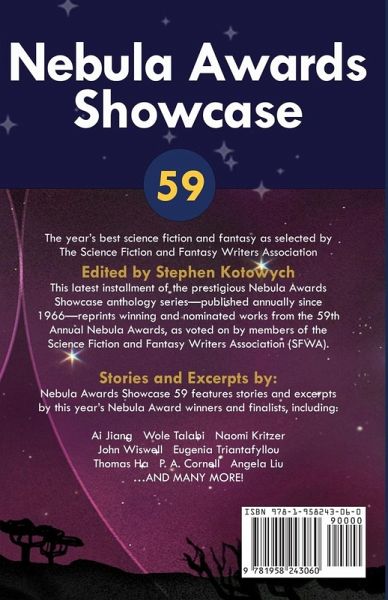 The year's best science fiction and fantasy as selected by The Science Fiction and Fantasy Writers Association This latest installment of the prestigious Nebula Awards Showcase anthology series-published annually since 1966-reprints winning and nominated works from the 57th Annual Nebula Awards, as voted on by members of the Science Fiction and Fantasy Writers Association (SFWA). Nebula Awards Showcase 59 features stories and excerpts by this year's Nebula Award winners and finalists, including Ai Jiang, Wole Talabi, Naomi Kritzer, John Wiswell, Eugenia Triantafyllou, Thomas Ha, P. A. Cornell, Angela Liu ... AND MANY MORE!