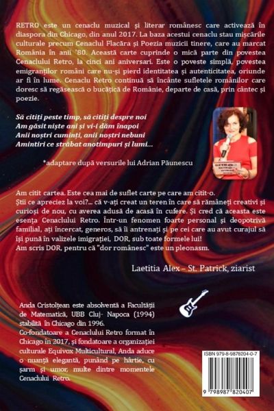 RETRO este un cenaclu muzical ¿i literar românesc care activeaz¿ în diaspora din Chicago din anul 2017. La baza acestui cenaclu stau mi¿c¿rile culturale precum Cenaclul Flac¿ra ¿i Poezia muzicii tinere, care au marcat România în anii '80. Aceast¿ carte cuprinde o mic¿ parte din povestea Cenaclului Retro, la cinci ani aniversari. Este o poveste simpl¿, povestea emigrantului român care nu-¿i pierde identitatea ¿i autenticitatea, oriunde ar fi in lume. Cenaclul Retro continü s¿ încânte sufletele românilor care doresc s¿ reg¿seasc¿ o buc¿¿ic¿ de Românie, departe de cas¿, prin cântec ¿i poezie. ¿¿¿ Misiunea Cenaclului Retro: Dorin¿a noastr¿ este s¿ v¿ aducem frumosul în viä¿ ¿i lumina în suflet. V¿ invit¿m s¿ fredon¿m împreun¿ cântece dragi, s¿ ne amintim de versurile din bibliotecile de acas¿, s¿ creem versuri ¿i melodii noi, s¿ sim¿im române¿te. Renätem Elogiind Tr¿irile Române¿ti Oriunde-am fi... Motto: Corina Vlad S¿ citi¿i peste timp, s¿ citi¿i despre noi Am g¿sit ni¿te ani ¿i vi-i d¿m înapoi Anii nötri cumin¿i, anii nötri nebuni Amintiri ce str¿bat anotimpuri ¿i lumi... adaptare dup¿ versurile lui Adrian P¿unescu Am citit cartea. Este cea mai de suflet carte pe care am citit-o. ¿tii ce apreciez la voi?... c¿ v-äi creat un teren în care s¿ r¿mâne¿i creativi ¿i curiöi de nou, cu averea adus¿ de acas¿ în cufere. ¿i cred c¿ aceasta este esen¿a Cenaclului Retro. Într-un fenomen foarte personal ¿i deopotriv¿ familial, äi încercat, generos, s¿ îi antrenäi ¿i pe cei care au avut curajul s¿ î¿i pun¿ în valizele imigräiei, DOR, sub toate formele lui! Am scris DOR, pentru c¿ "dor românesc" este un pleonasm. Laetitia Alex - St. Patrick, ziarist The MUSIC, POETRY and ART transcends the language barriers. RETRO is a Romanian Musical and Literary Circle (Cenacle) whose members share the same love for the cultural movements like Cenaclul Flacara and The Poetry of Young Music, that marked Romania during the 80's. Their mission is a noble yet a simple one, to bring the music and the poetry of their generation back to life along with new compositions, for the benefit of the entire Romanian community, as well as for all the admirers and fans of European and folk music culture. *This book is written in the Romanian language...