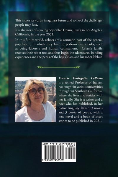 This is the story of an imaginary future and some of the challenges people may face. It is the story of a young boy called Criam, living in Los Angeles, California, in the year 2051. In this future world, robots are a common part of the general population, in which they have to perform many tasks, such as being laborers and human companions. Criam's family receives their robot too, and thus begin the adventures, bonding experiences and the perils of the boy Criam and his robot Nebur. Francie Fridegotto LoRusso is a retired Professor of Italian, has taught in various universities throughout Southern California, where she lives and resides with her family. She is a writer and a poet who has published, in her native language Italian, 3 novels and 3 books of poetry, with a new novel and a book of short stories to be published in 2021.