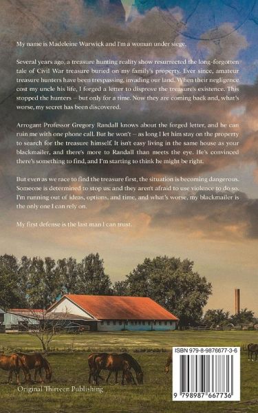 My name is Madeleine Warwick and I'm a woman under siege. Several years ago, a treasure hunting reality show resurrected the long-forgotten tale of Civil War treasure buried on my family's property. Ever since, amateur treasure hunters have been trespassing, invading our land. When their negligence cost my uncle his life, I forged a letter to disprove the treasure's existence. This stopped the hunters - but only for a time. Now they are coming back and, what's worse, my secret has been discovered. Arrogant Professor Gregory Randall knows about the forged letter, and he can ruin me with one phone call. But he won't - as long I let him stay on the property to search for the treasure himself. It isn't easy living in the same house as your blackmailer, and there's more to Randall than meets the eye. He's convinced there's something to find, and I'm starting to think he might be right. But even as we race to find the treasure first, the situation is becoming dangerous. Someone is determined to stop us: and they aren't afraid to use violence to do so. I'm running out of ideas, options, and time, and what's worse, my blackmailer is the only one I can rely on. ¿My first defense is the last man I can trust.