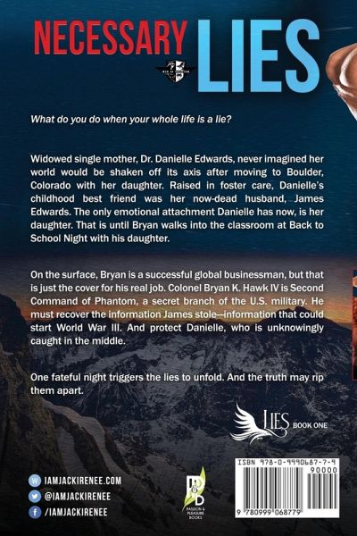 What do you do when you discover your whole relationship is a lie? Widowed single mother, Dr. Danielle Edwards, never imagined her world would be shaken off its axis after moving to Boulder, Colorado with her daughter. Raised in foster care, Danielle's childhood best friend was her now-dead husband, James Edwards. The only emotional attachment Danielle has now, is her daughter. That is until Bryan walks into the classroom at Back to School Night with his daughter. On the surface, Bryan is a successful global businessman, but that is just the cover for his real job. Colonel Bryan K. Hawk IV is Second Command of Phantom, a secret branch of the U.S. military. He must recover the information James stole-information that could start World War III. And protect Danielle, who is unknowingly caught in the middle. One fateful night triggers the lies to unfold. And the truth may rip them apart.