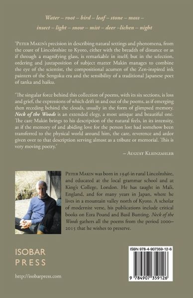 "Peter Makin's precision in describing natural settings and phenomena, from the coast of Lincolnshire to Kyoto, either with the breadth of distance or as if through a magnifying glass, is remarkable in itself; but in the selection, ordering and juxtaposition of subject matter Makin manages to combine the eye of the scientist, the compositional acumen of the Zen-inspired ink painters of the Sengoku era and the sensibility of a traditional Japanese poet of tanka and haiku. The singular force behind this collection of poems is loss and grief, the expressions of which drift in and out of the poems, as if emerging then receding behind the clouds, usually in the form of glimpsed memory. Neck of the Woods is an extended elegy, a most unique and beautiful one. The care Makin brings to his description of the natural feels, in its intensity, as if the memory of and abiding love for the person lost had somehow been transferred to the physical world around him, thus serving almost as a tribute or memorial. This is very moving poetry." (August Kleinzahler)