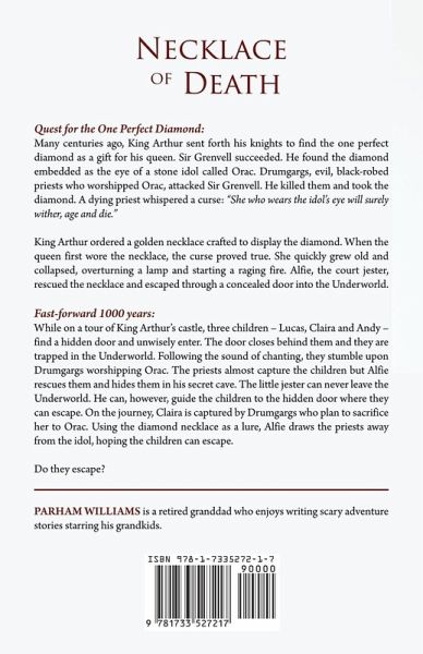 Quest for the One Perfect Diamond: Many centuries ago, King Arthur sent forth his knights to find the one perfect diamond as a gift for his queen. Sir Grenvell succeeded. He found the diamond embedded as the eye of a stone idol called Orac. Drumgargs, evil, black-robed priests who worshipped Orac, attacked Sir Grenvell. He killed them and took the diamond. A dying priest whispered a curse: "She who wears the idol’s eye will surely wither, age and die." King Arthur ordered a golden necklace crafted to display the diamond. When the queen first wore the necklace, the curse proved true. She quickly grew old and collapsed, overturning a lamp and starting a raging fire. Alfie, the court jester, rescued the necklace and escaped through a concealed door into the Underworld. Fast-forward 1000 years: While on a tour of King Arthur’s castle, three children – Lucas, Claira and Andy – find a hidden door and unwisely enter. The door closes behind them and they are trapped in the Underworld. Following the sound of chanting, they stumble upon Drumgargs worshipping Orac. The priests almost capture the children but Alfie rescues them and hides them in his secret cave. The little jester can never leave the Underworld. He can, however, guide the children to the hidden door where they can escape. On the journey, Claira is captured by Drumgargs who plan to sacrifice her to Orac. Using the diamond necklace as a lure, Alfie draws the priests away from the idol, hoping the children can escape. Do they escape?