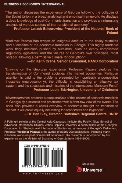 "The author discusses the experience of Georgia following the collapse of the Soviet Union in a broad analytical and empirical framework. He displays a deep knowledge of post-Communist transition and provides an interesting analysis of various sectors of the transitional economy." -Professor Leszek Balcerowicz, President of the National Bank of Poland "Vladimer Papava has written an insightful account of the policy mistakes and successes of the economic transition in Georgia. This highly readable work flags mistakes pushed by outsiders, such as overly complicated regulatory legislation, and the failures of Georgia's own politicians, most notably, allowing a permissive climate for corruption." -Dr. Keith Crane, Senior Economist, RAND Corporation "Drawing on the Georgian experience, Professor Papava explores the transformation of Communist societies into market economies. Particular attention is paid to the problems presented by hopelessly uncompetitive industries (necroeconomy), the difficulty in establishing an effective tax system, and the successes and mistakes of the International Monetary Fund." -Professor Louis Ederington, University of Oklahoma "Necroeconomics presents a deep analysis of the lessons of economic transition in Georgia by a scientist and practitioner with a front-row view of the events. The book also provides a useful overview of economic thought on transition to market. It will prove equally interesting for economists and laypeople." -Dr. Ben Slay, Director, Bratislava Regional Centre, UNDP