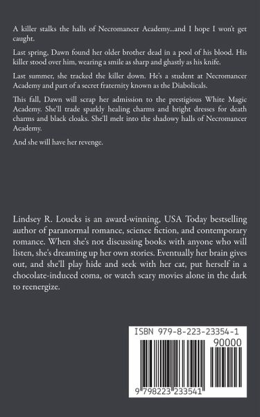 Last spring, Dawn found her older brother dead in a pool of his blood. His killer stood over him, wearing a smile as sharp and ghastly as his knife. Last summer, she tracked the killer down. He's a student at Necromancer Academy and part of a secret fraternity known as the Diabolicals. This fall, Dawn will scrap her admission to the prestigious White Magic Academy. She'll trade sparkly healing charms and bright dresses for death charms and black cloaks. She'll melt into the shadowy halls of Necromancer Academy. And she will have her revenge. Necromancer Academy is the first book in a four-book series. Each book ends in a cliffhanger. One-click now for your acceptance into Necromancer Academy! Don't miss the rest of the series: Necromancer Unleashed: Book 2 Necromancer Revealed: Book 3 Necromancer Uprising: Book 4