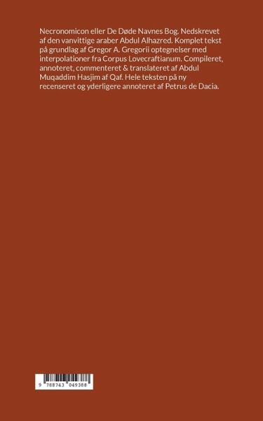 Necronomicon eller De Døde Navnes Bog. Nedskrevet af den vanvittige araber Abdul Alhazred. Komplet tekst på grundlag af Gregor A. Gregorii optegnelser med interpolationer fra Corpus Lovecraftianum. Compileret, annoteret, commenteret & translateret af Abdul Muqaddim Hasjim af Qaf. Hele teksten på ny recenseret og yderligere annoteret af Petrus de Dacia.