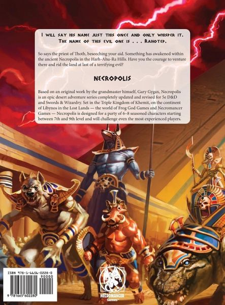 I will say his name just this once and only whisper it. The name of this evil one is . . . Rahotep. So says the priest of oth, beseeching your aid. Something has awakened within the ancient Necropolis in the Harh-Ahu-Ra Hills. Have you the courage to venture there and rid the land at last of a terrifying evil? NECROPOLIS Based on an original work by the grandmaster himself, Gary Gygax, Necropolis is an epic desert adventure series completely updated and revised for 5e D&D and words & Wizardry. Set in the Triple Kingdom of Khemit, on the continent of Libynos in the Lost Lands - the world of Frog God Games and Necromancer Games - Necropolis is designed for a party of 6-8 seasoned characters starting between 7th and 9th level and will challenge even the most experienced players.