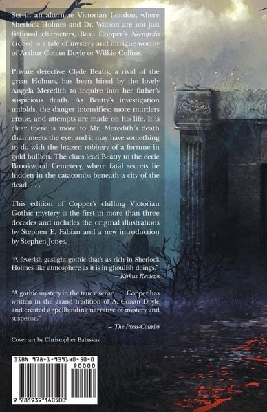 "A feverish gaslight gothic that's as rich in Sherlock Holmes-like atmosphere as it is in ghoulish doings." - Kirkus Reviews "A dark, exotic Gothic thriller . . . Excellent!" - Booklist "A gothic mystery in the truest sense. . . . Copper has written in the grand tradition of A. Conan Doyle and created a spellbinding narrative of mystery and suspense." - The Press-Courier Set in an alternate Victorian London, where Sherlock Holmes and Dr. Watson are not just fictional characters, Basil Copper's Necropolis (1980) is a tale of mystery and intrigue worthy of Arthur Conan Doyle or Wilkie Collins. Private detective Clyde Beatty, a rival of the great Holmes, has been hired by the lovely Angela Meredith to inquire into her father's suspicious death. As Beatty's investigation unfolds, the danger intensifies: more murders ensue, and attempts are made on his life. It is clear there is more to Mr. Meredith's death than meets the eye, and it may have something to do with the brazen robbery of a fortune in gold bullion. The clues lead Beatty to the eerie Brookwood Cemetery, where fatal secrets lie hidden in the catacombs beneath a city of the dead. . . . This edition of Copper's chilling Victorian Gothic mystery is the first in more than three decades and includes the original illustrations by Stephen E. Fabian and a new introduction by Stephen Jones. Copper's tale of Lovecraftian horror, The Great White Space (1974) is also available from Valancourt Books.
